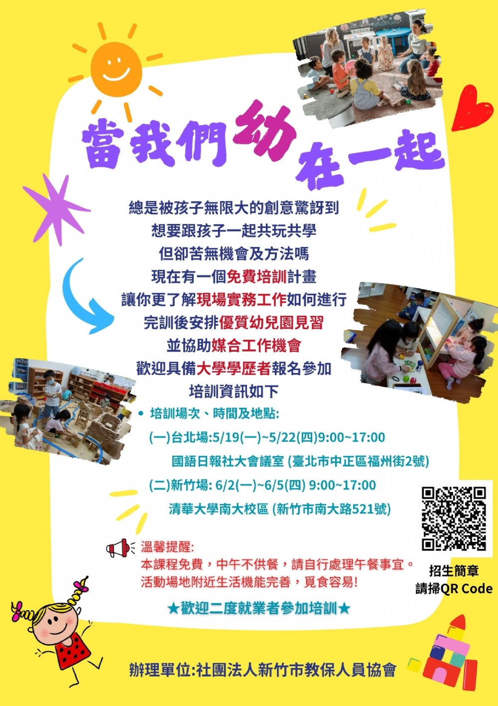 現在您的機會來了~~新竹市教保人員協會爭取到捐款,開設免費培訓計畫,讓您更了解現場實務工作如何進行。